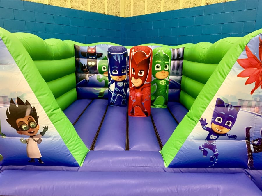 11ftx15ft PJM themed low height Bouncy castle. Comes with Owlette, Catboy and Gecko bashers. Perfect for indoor parties. Can be hired on its own or as part of our Masks packages.
