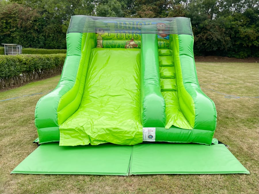 This slide is designed for younger children. It has a 5ft platform and easy to climb steps. The platform at the top of the slide is fully enclosed and has tall side walls to keep the children safe. This can be hired as a single unit or can be hired in a package with our other Jungle themed equipment.