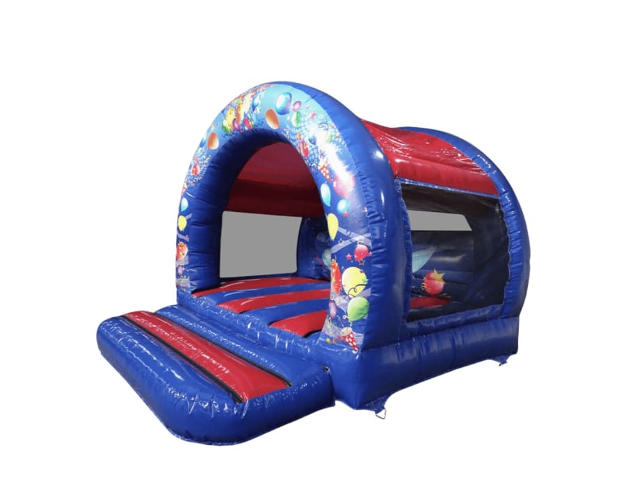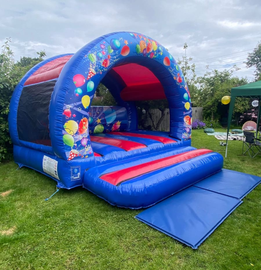 12ft x12ft celebration themed bouncy castle. Comes with a built in rain cover.