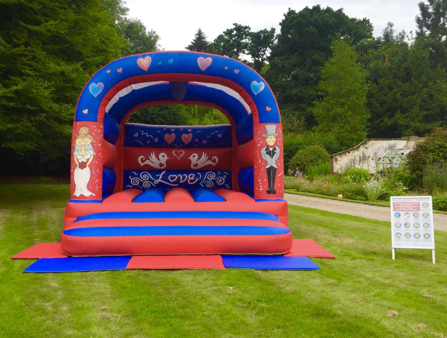 Wedding themed bouncy castle. Suitable for adults. This castle has a fitted rain cover so no need to worry about a little drizzle or beaming sun.