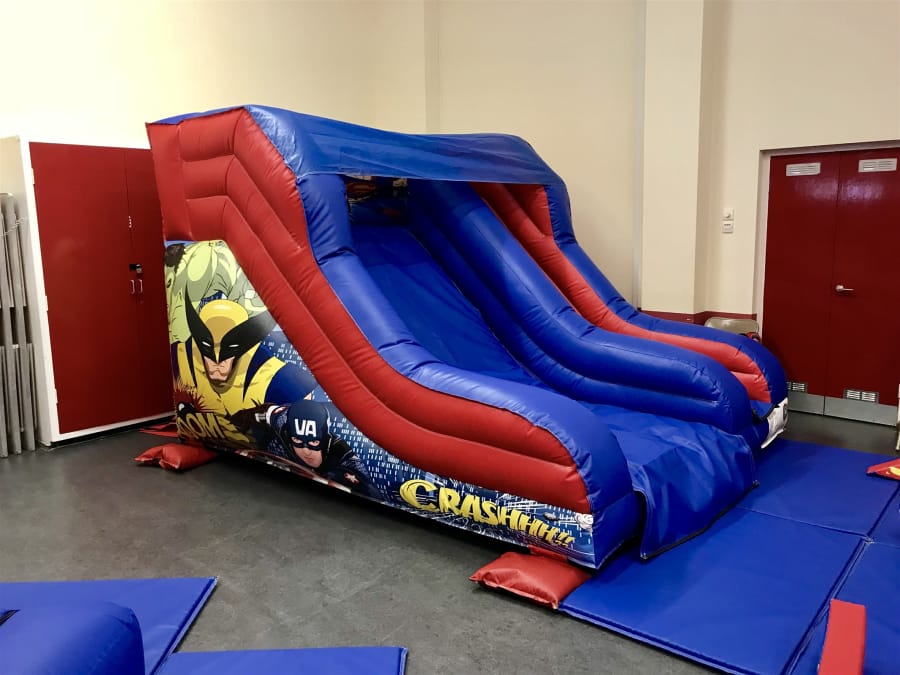 This slide is designed for younger children. It has a 5ft platform and easy to climb steps. The platform at the top of the slide is fully enclosed and has tall side walls to keep the children safe. This can be hired as a single unit or can be used in combination with our other Superhero themed equipment such as soft play and ball pool.