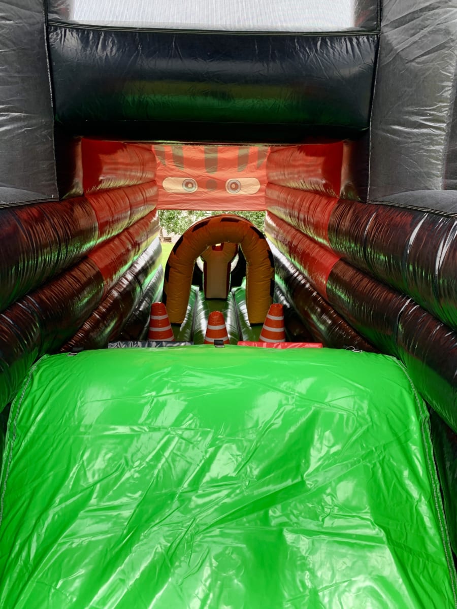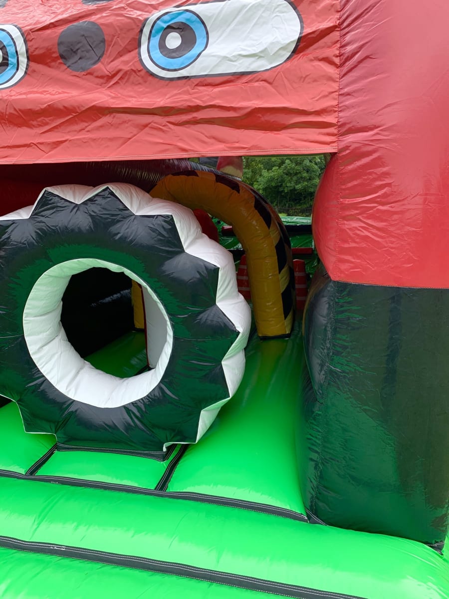 The inflatable Fun run has an entrance with full theming, followed by a series of biff and bash pillars, cool chill out area in the middle, steep ladder climb and a crazy slide out of the end. Even the toys inside are vehicle themed. The obstacle course is the perfect choice for your little one's birthday party, school or summer fete.