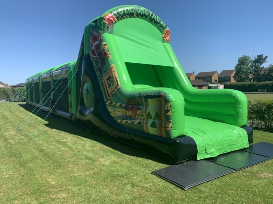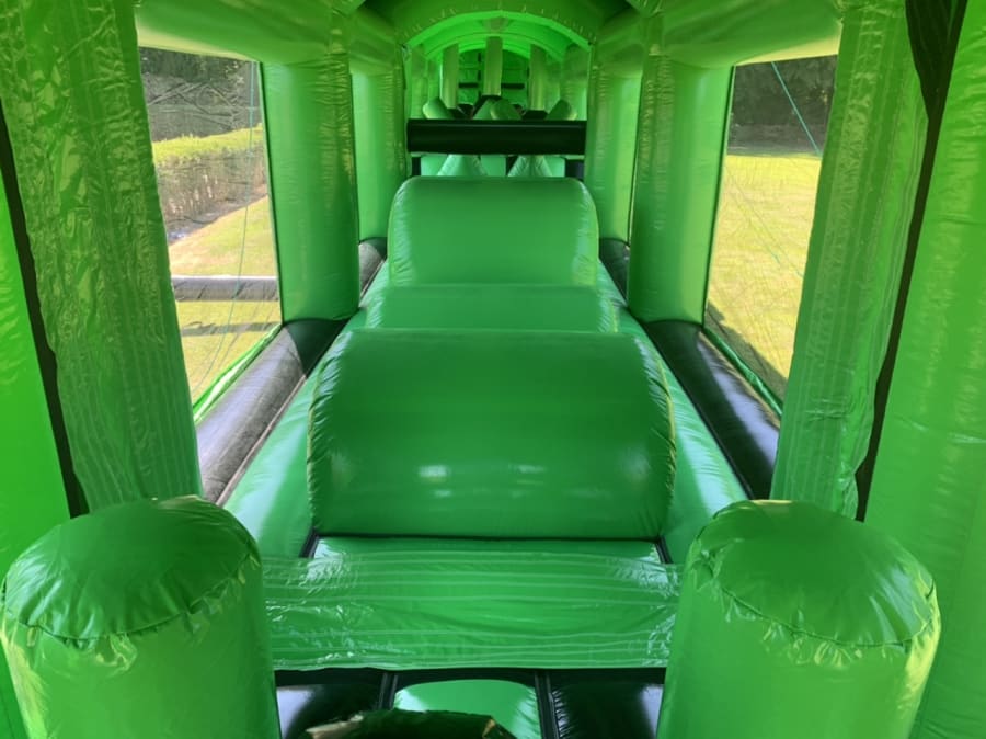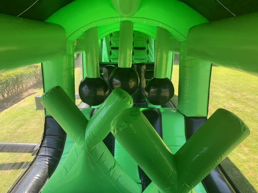 The double entranceway leads to a bish bash area before opening up into a large humped section to hurdle over, once across the humps its through a letterbox, through the x beams, up a ramp with swinging balls through two large bashers and through another letterbox. You will then be confronted by a steep ladder climb to the top of the 10ft platform then over the top and down the slide to finish.