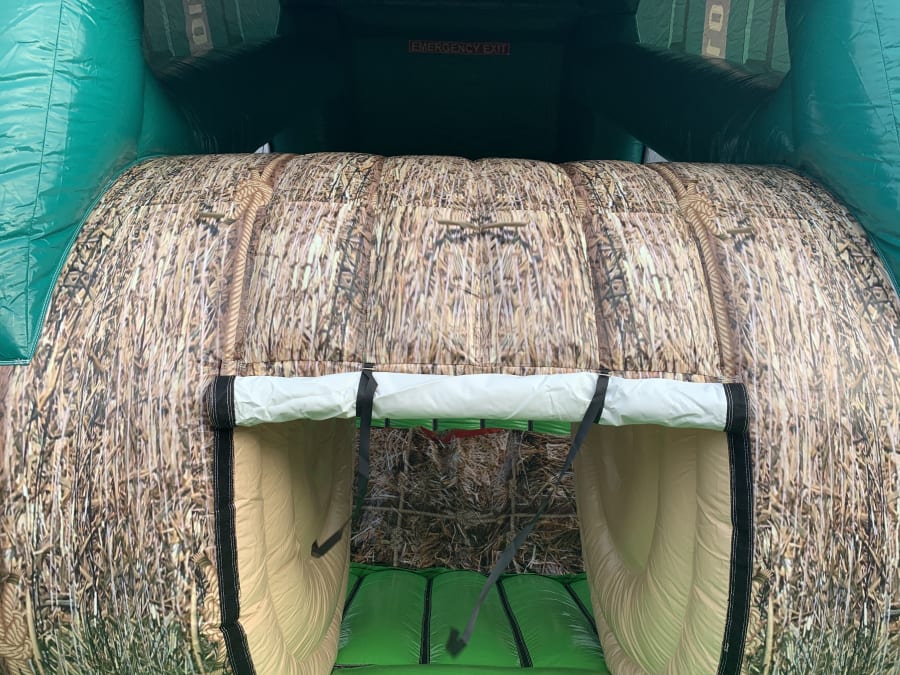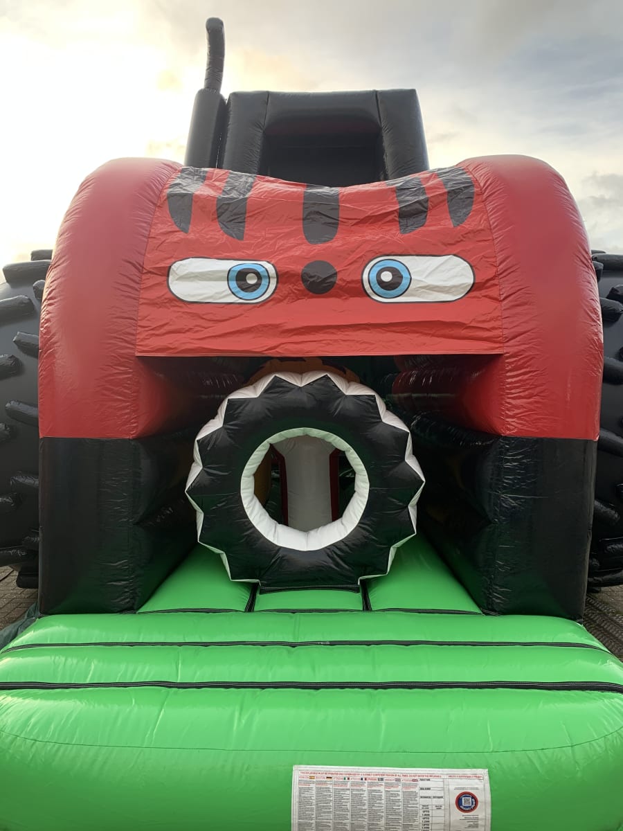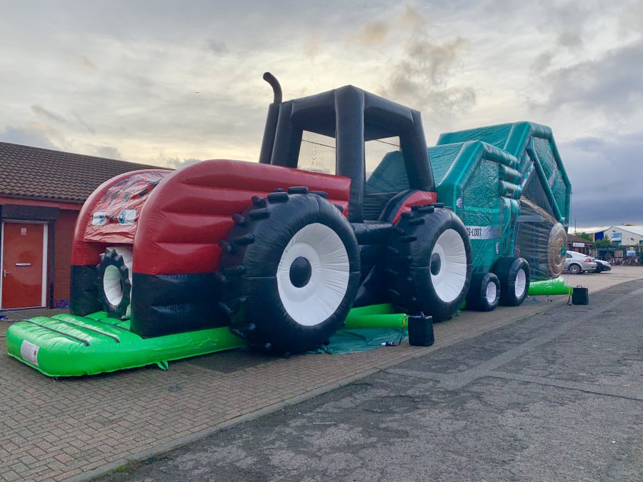 The entrance is at the front of the Tractor, followed by a series of biff and bash pillars, cool chill out area in the middle, steep ladder climb and a crazy slide out of the end. The Bailer is a huge base jump with a 10ft high platform to jump off onto a padded hay bail. Finally exiting the fun run through another bail of hay at the rear.