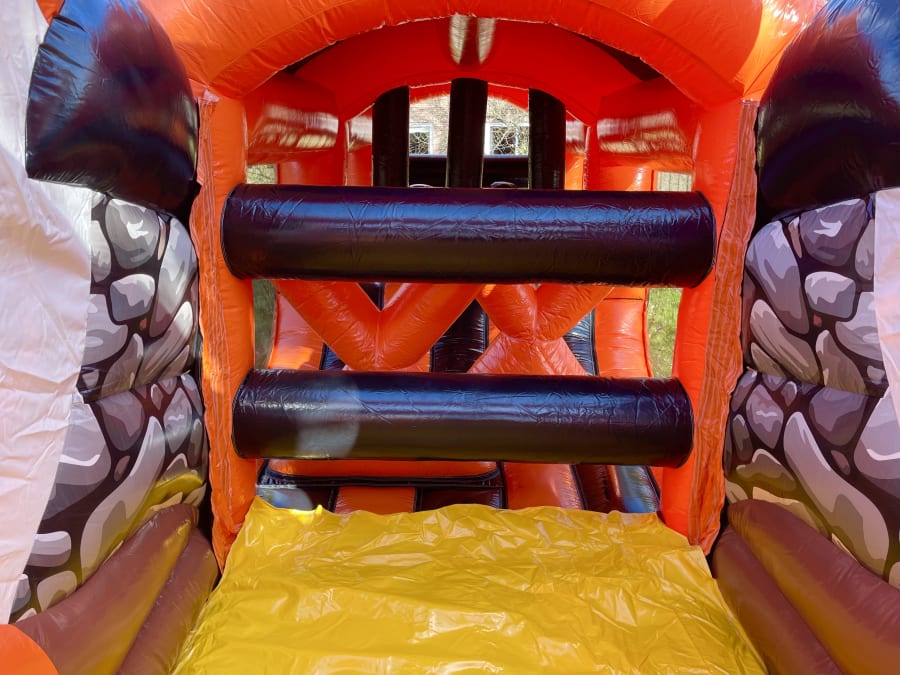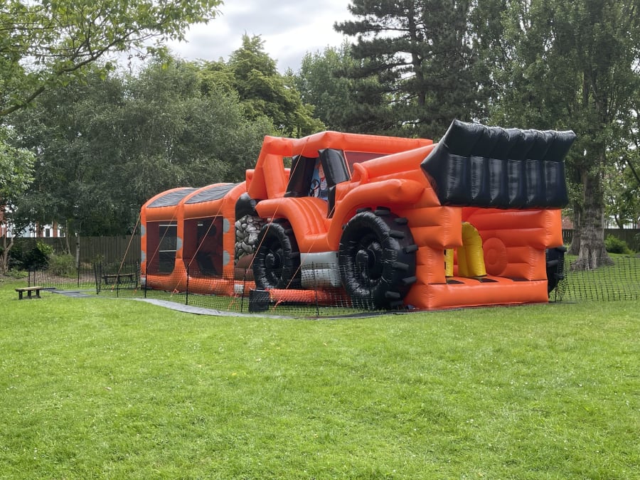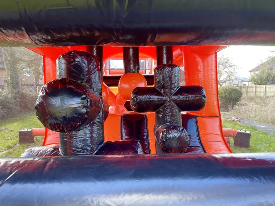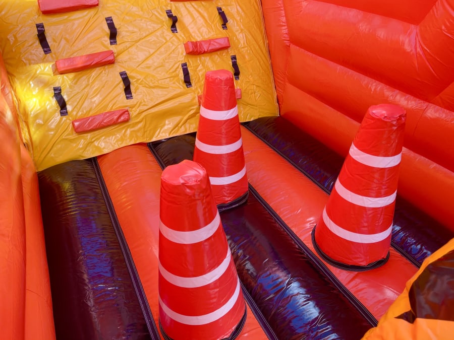 This inflatable Fun run has an entrance with full theming, followed by a series of biff and bash pillars, cool chill out area in the middle, steep ladder climb and a crazy slide. then through a letterbox, past two obstacles, a set of wrecking balls, more obstacles and finally out of the end through another letterbox! Even the toys inside are vehicle themed. The obstacle course is the perfect choice for your little one's birthday party, school or summer fete.