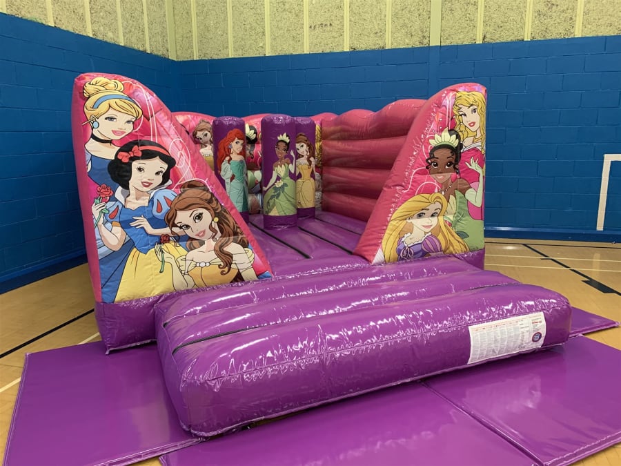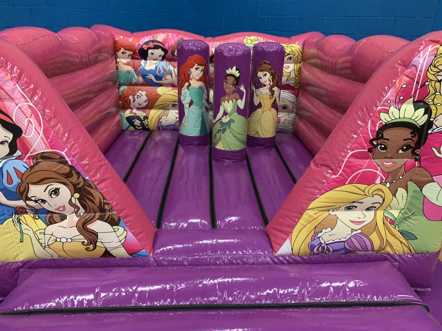 11ftx15ft Princess themed low height Bouncy Castle. Comes with Ariel, Tiana and Belle bashers. Perfect for indoor parties. Can be hired on its own or as part of our Princess Packages.
