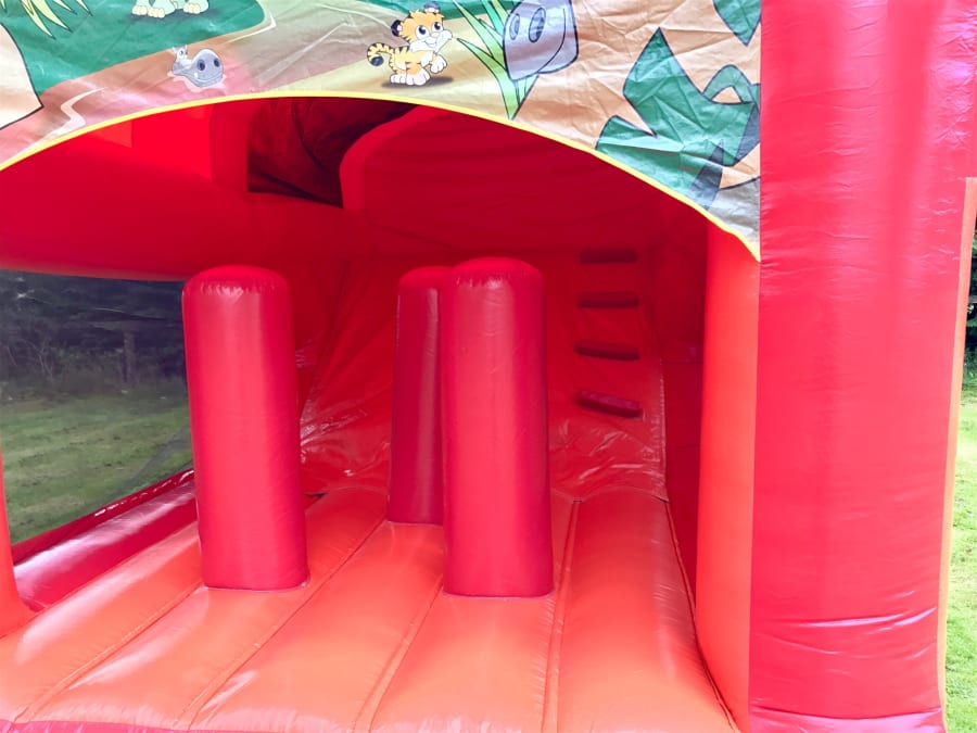 Tiger themed activity castle. Features an internal slide along the back wall and 3 bashers toward the front.