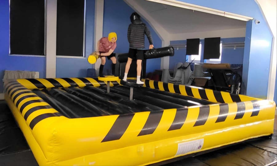 Gladiator Jousting is a 2 player game designed for each person to stand on a podium and attempt to knock the other player off with the pugil sticks provided.