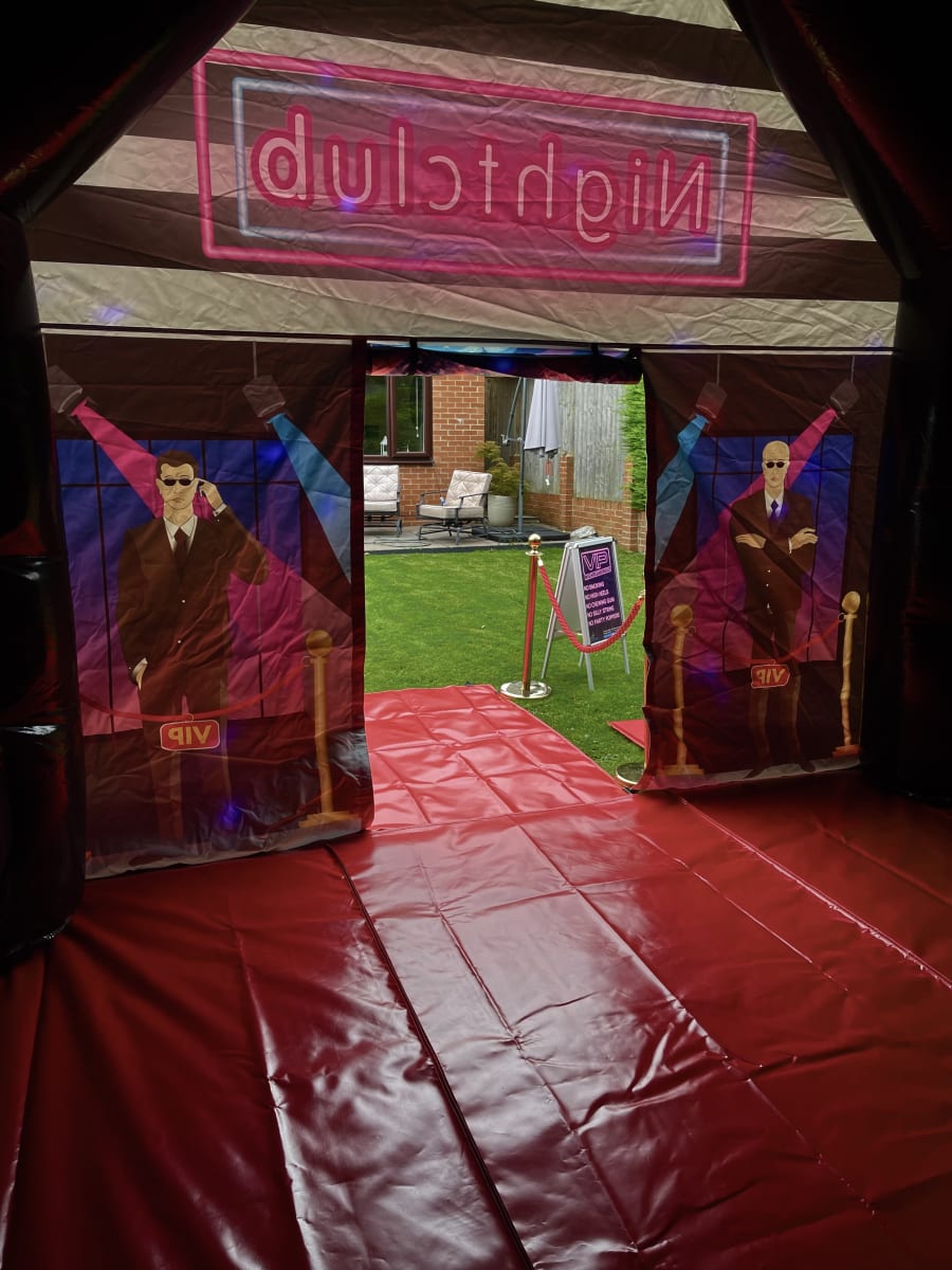 Our Nightclub comes with a red vinyl floor, gold VIP barriers with red rope attachments, a disco light and a large 12 inch Bluetooth speaker.
