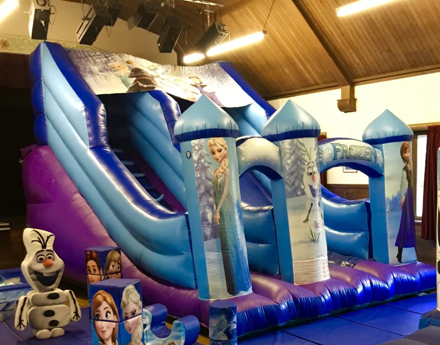 Frozen themed slide with 8ft platform. Can be used indoors as well as outdoors. It does not require the same space dimensions seen on the chart for indoor use, these dimensions are 18ftx25ftx16ft