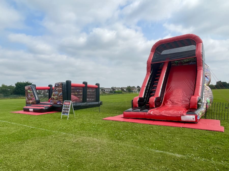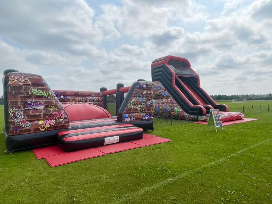 This package contains a large slide with a 12ft platform and a large 20ft x 20ft bouncy castle known as the Airsoft Mountain. Both these inflatables feature the same street style Graffiti themed artwork. It is ideal for end of school term fairs, small events as well as private garden parties. We can supply trained staff to supervise the inflatables during the hire period at extra cost.
