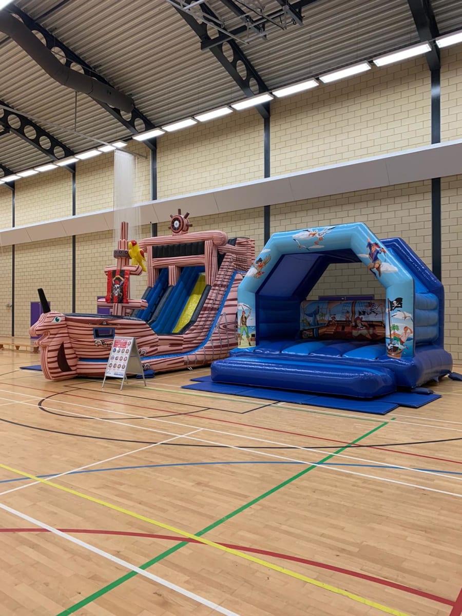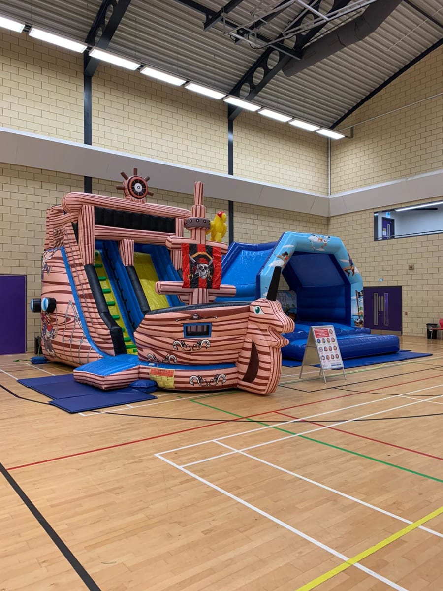 This package contains a large 24ft x14ft Pirate Ship slide with a 10ft platform and a large 15ft x 15ft Bouncy Castle.