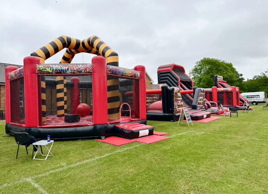 All three of these inflatables feature the same street style Graffiti themed artwork. It is ideal for end of school term fairs, events as well as private garden parties. We can supply trained staff to supervise the inflatables during the hire period at extra cost.